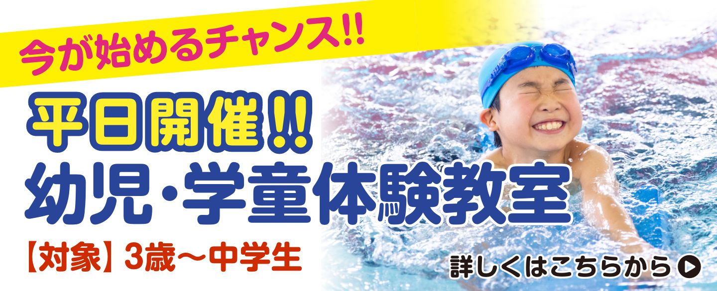 2025.10.31 お知らせ 【幼児・学童】11~12月特別体験教室のお知らせ! スイミングは誰にでもできる生涯スポーツ! 水泳は全身運動で他の運動にも役立つだけではなく、 子供のときに覚えれば、生涯その技術は忘れることはありません。 【幼児・学童】 体験教室開催日のお知らせ 日曜日・祝日開催 【開催日】 11月9日(日)・24日(月祝) 12月7日(日)・21日(日) 【体 験】10:00~11:00 【説明会】11:00~12:00 【受 付】9:45 【参加費】500円 体験教室のご予約はこちらから!!