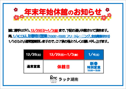 誠に勝手ながら、12/29(日)~1/3(金)まで、下記の通り休館させていただきます。