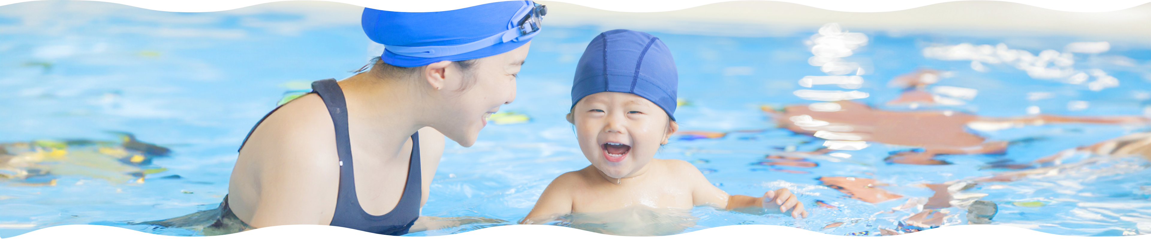 さあ、いよいよプールレッスンです。お母さんと一緒に広いプールでのびのびと泳ごう!ママレッスンもあるので、お母さんのシェイプアップにも効果的!